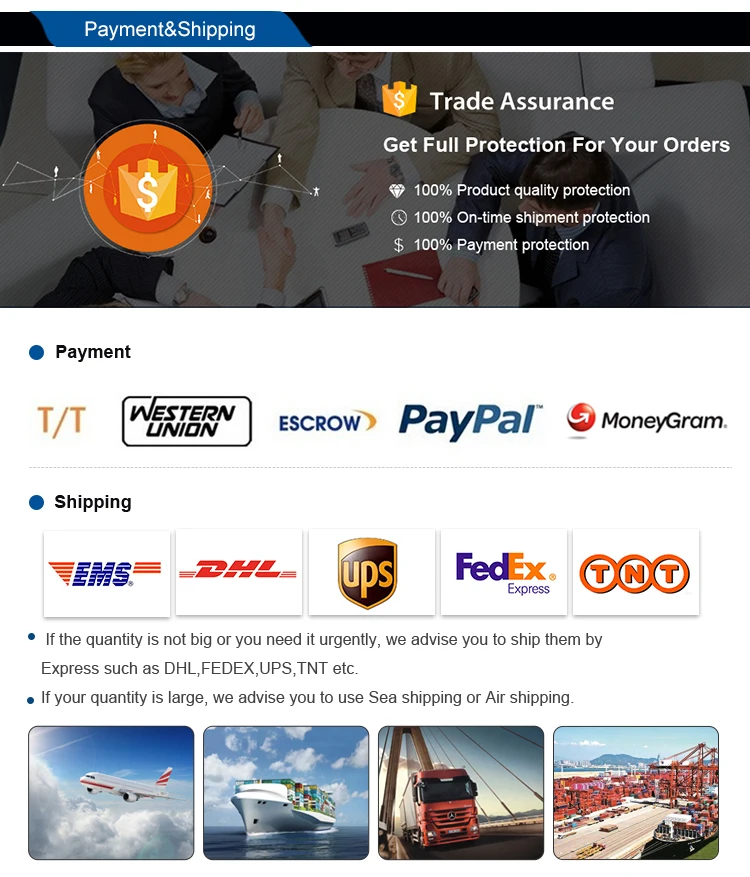 T/T 30% as deposit, and 70% before delivery. We’ll show you the photos of the products and packages